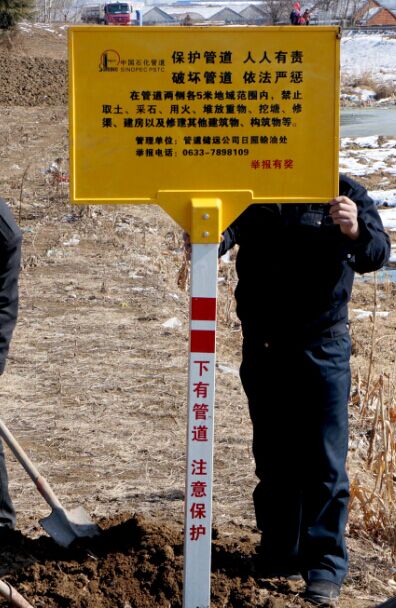 警示牌,中石油燃气管道指示牌,玻璃钢电力警示牌,燃气管道指示牌,自来水管道标识牌,用手糊玻璃钢材料,工艺为手工制作,自然冷却成品,树脂同固化剂在自然条件下发生反应,常常伴随着有气体产生,所以贴上反光膜后容易起泡,而且,手工操作,因人而已,常常壁厚不均等因素,不适合大批量生产。 挤出玻璃钢工艺。由于受制于工艺要求,挤出玻璃钢表面不平,有气孔,所以对反光膜的粘接力不足。所以也不适宜做交通标志底板。 模压玻璃钢是在高温高压下成型的,表面平,对反光膜的附着力满足要求。按***测试反光膜对标志底板附着性能的实验,实验5分钟后,反光膜的氤ざ任?-4mm,大大小于标准要求的20mm。